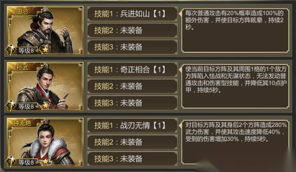 2、田忌、孙武、钟无艳:金色戟兵羁绊部队,同部队武将的武力得到了很大提升,田忌可概率控制且额外增加伤害,钟无艳则是提供了3个目标伤害、减攻速、增伤不同效果,孙武核心关键使敌方多个方阵陷入无法普攻和无法施法状态,并降低护甲。