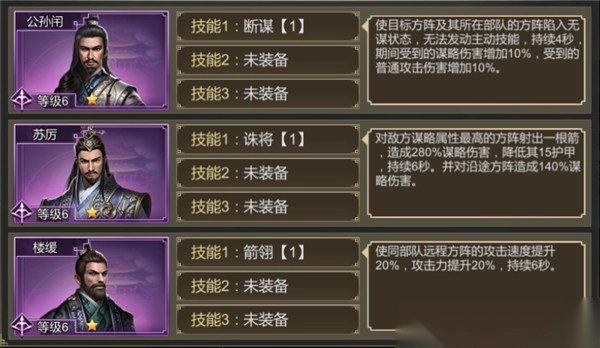 1、公孙闬、苏历、楼缓:紫色弓兵羁绊部队,提升了极高兵种攻击力和护甲值,大大增加了兵种整体作战能力,公孙闬为控制增伤型辅助武将,苏历则作为群攻武将增加杀伤方阵数量,楼缓则为同部队提高了攻速和攻击。