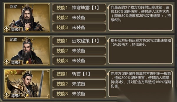 3、陈轸、范雎、李斯:金色控制弓兵羁绊部队,羁绊效果虽提升略低,但提升了20%攻速也是相当可观的。陈轸对3个方阵造成伤害并降低双速,李斯则以斩首控制敌方高谋略武将,并沿途造成谋略伤害。范雎为前两者提供了一定攻速和攻击力,大大提升了全队输出能力。