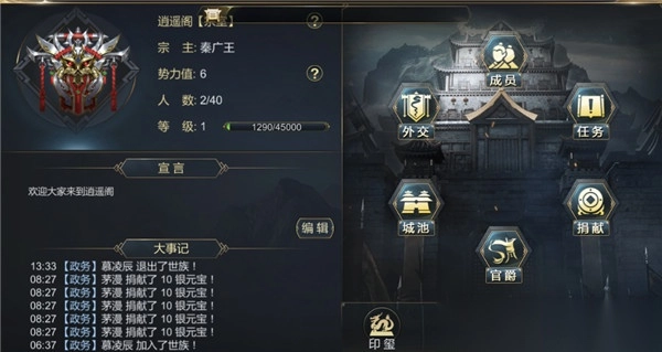 2、右上部分则主要分为成员、任务、捐献、官爵、城池、外交几个功能,右下部分为印玺、仓库、商店、沦陷。