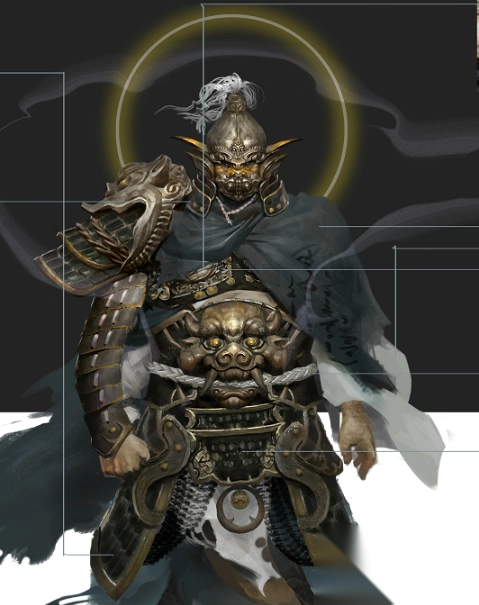 细心的大家肯定也发现了美术大大在设计该BOSS时候也和他下凡取经的猪八戒的角色有呼应的细节,例如束腰这里有个猪脸形象的设计,还有例如天蓬元帅脸上戴的面罩虽然挡住了他脸的露出,但是我们可以对面具下的脸进行联想也很难不和猪八戒的形象联系起来。