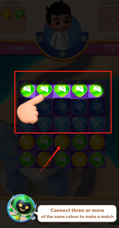 3、在游戏画面中,角色头顶显示关卡1、步数5以及分数0 。画面中间有五个带叶子的绿色方块处于亮起状态。需要注意的是,只有连着三个或三个以上相同颜色的方块,才能够实现消除。