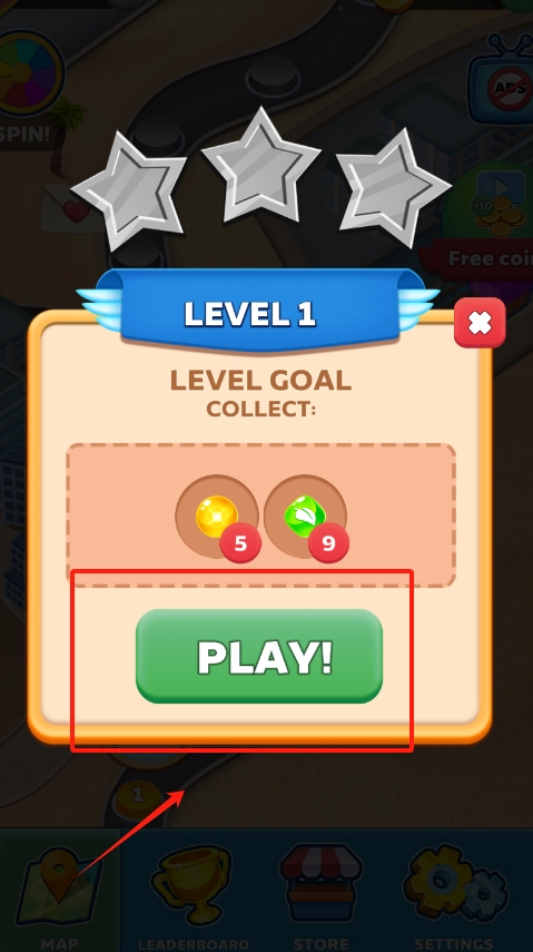 2、关卡界面顶上三颗银星是评分,写着LEVEL1,目标是收集5个和9个两种道具,底部绿色大按钮点下去就能开始闯关。