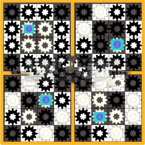 黑底搭配暗齿轮,白底搭配亮齿轮,当点击某个齿轮时,其相邻位置(即上下左右方向)会一同发生颜色变化。