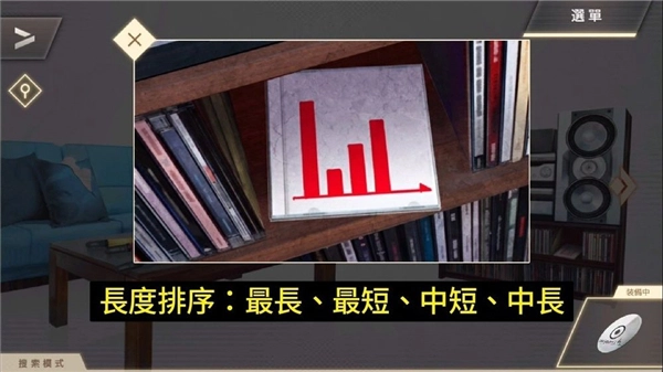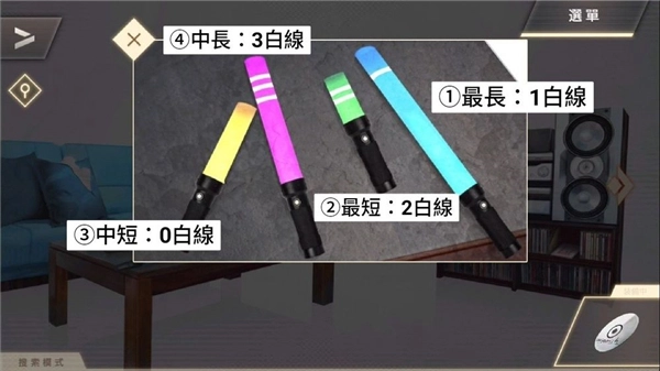 ⑧ 移动到「左房间」光碟机解谜,观察柜子股市表、桌上萤光棒长度及条纹数量