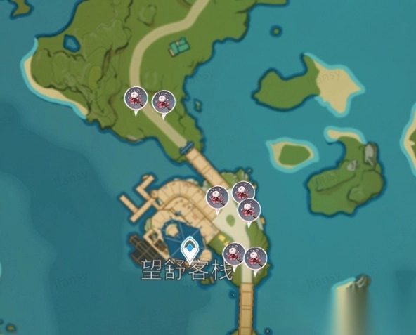 2、望舒客栈:总计14株,分布于客栈前道路的两侧以及门楼。从传送锚点出发往下走,过桥之后,北侧同样存在,要留意石板路以及草丛的缝隙之处。