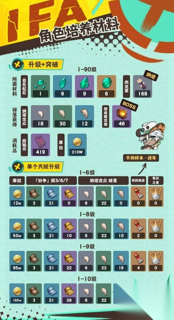 1. 升级与突破所需耗材:自在松石(分别为1枚、9枚、9枚、6枚)、纳塔龙拳168只、由BOSS掉落的熔岩辉龙像46个、小怪掉落的纳塔龙众60个(18 + 30 + 12),此外还需消耗419本经验书以及210W摩拉。