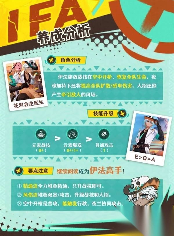 《原神》伊法全方位养成攻略:伊法作为风元素角色,在扩散反应与技能输出方面表现出色,定位为副C或功能型辅助。凭借高频且可控的元素战技,伊法能够高效扩散水、雷、冰等后台元素,为主C创造连锁打击的有利条件。其天赋着重强化扩散感电伤害,元素战技与爆发是主要的输出手段。命座方面,从二命开始优化输出节奏,到六命时可提升综合爆发能力。武器与圣遗物的选择,需依据定位,分别朝着精通方向或双暴方向进行搭配。