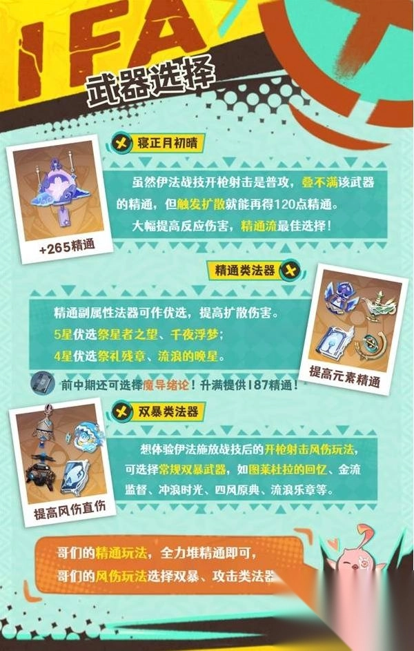 3、机制契合剖析:寝正月初晴这件武器,虽然在实战中较难叠满精通(注:伊法的战技被视作普攻),然而只要触发扩散效果,就能刷新其特效,与扩散玩法堪称完美契合。而双暴武器主要服务于风元素直接伤害,这种情况下需要升级角色的战技以及大招,如此便能兼顾输出与功能性。
