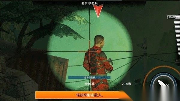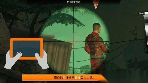 3、用左拇指操作屏幕,瞄准场景中的敌人士兵;