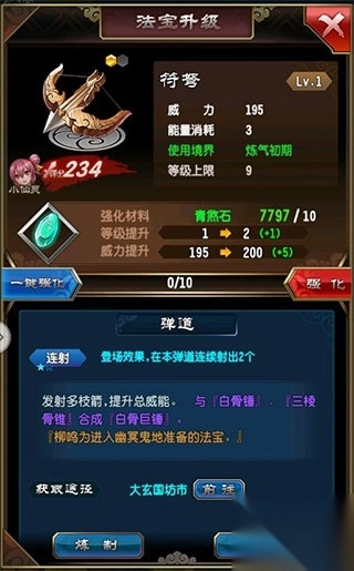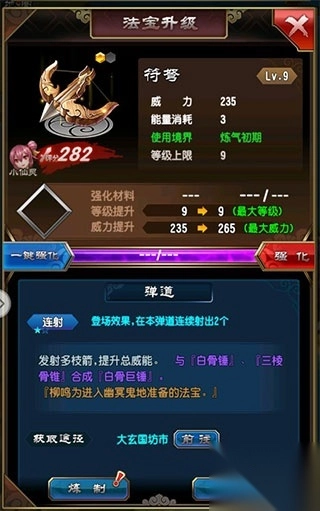 升级和炼制方法:打开行囊-选择需要炼制的法宝。