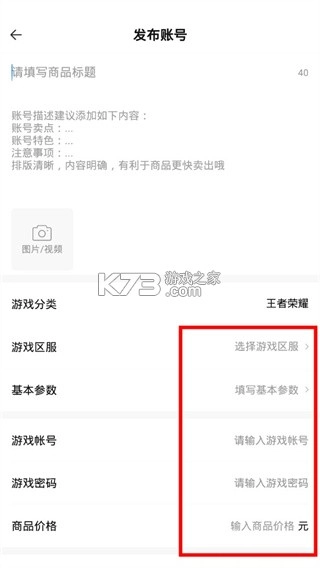 4、填写账号信息、区服等,完成发布。