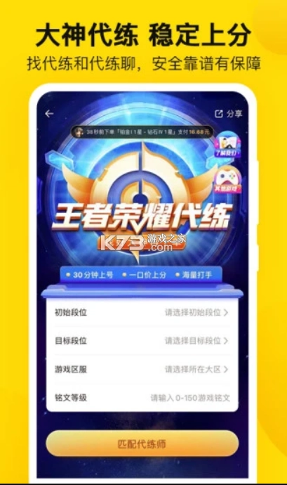 【赛季冲刺找专业代练陪玩,稳赢有把握】智能匹配大神玩家,沟通透明防欺诈,官方全方位监管,代练服务既高效又安全,助您上分毫无阻碍。