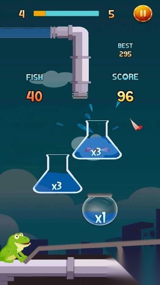 2、开局时,点击“TAP-TO-START”,启动管道出鱼机制,操控接鱼容器,接住掉落的鱼,积累分数。