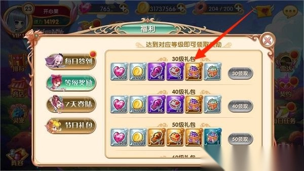3、福利界面内可见,达到相应级别即可获得包括钻石金币等在内的豪华奖励哦,此类奖励一经领取即在列表中消失。