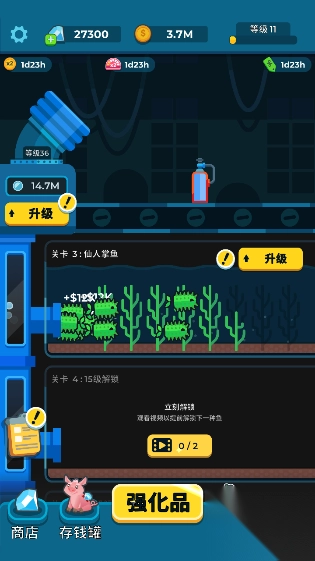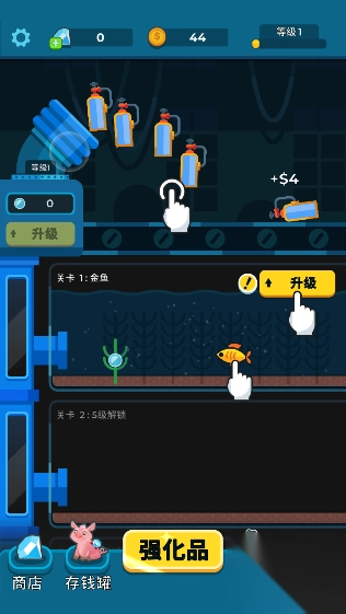 1、进入游戏后,点击小鱼加速收集气泡,提高产量。