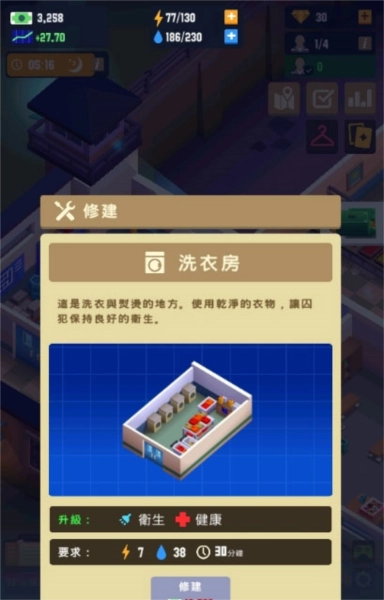3. 把资金投入到牢房建设上,全部升满,这可是赚钱的不二法门!关于防止暴动,要做到将牢房的愉快度升满,操场买满但无需升级,同时维持好食品供应、健康状况以及清洁程度就可以了。