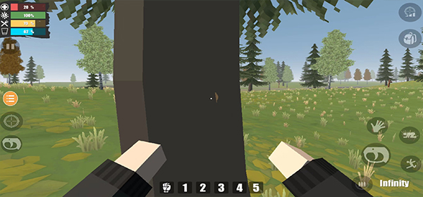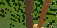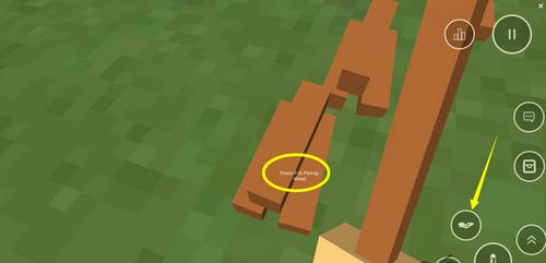 3、连续用力砍伐几次后,小树会消失并变成木头。此时,靠近木头,当出现可收取的英文提示时,点击右边的手型按钮就能捡起木头。一定要注意,只有靠近木头出现英文提示才行哦!