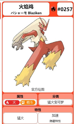 2、火焰鸡是一只火属性和格斗属性到宝可梦,分类是猛火宝可梦。