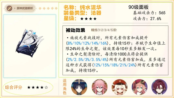 纯水流华和海渊有很多相似之处,都是高白值低副属性的搭配,90级基础攻击力为565,副属性27.6%的攻击力加成。并且被动特效都是跟生命之契有关,最大区别在于纯水流华的被动是提升元素伤害加成。