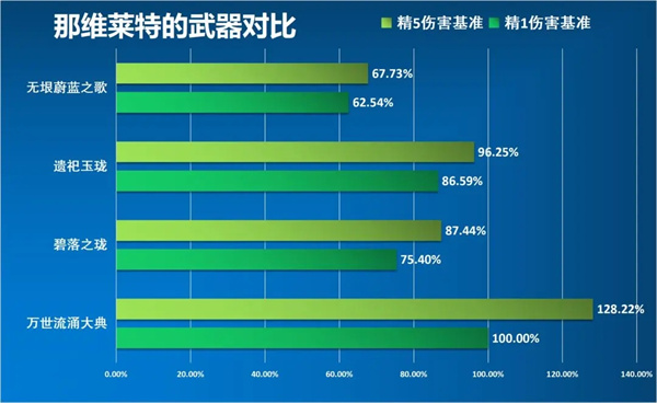 图片解析:以【精1】的伤害为基准100%,【精5】为1%,则说明【精5】相对于【精1】伤害提高1%,其他武器同理。有的武器没算精1和精5的伤害,说明该武器精1和精5的伤害一样。(想要知道不同武器的伤害差距或精炼差距,可根据上图自行对比。)