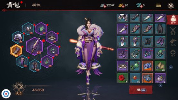 打开【背包】后我们能看见一个蜂巢样式的装备栏,玩家可在其中放置一把武器、头盔、战衣、腕甲、战裤、战靴、项链、指护、护腰、灵佩,共十件装备。