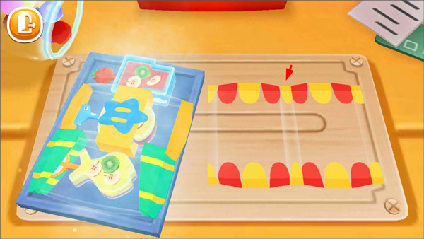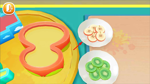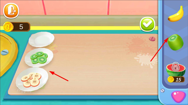 3、雪糕添加果酱之后玩家需要切一些水果放到里面,点击右侧的水果放到案板上即可;