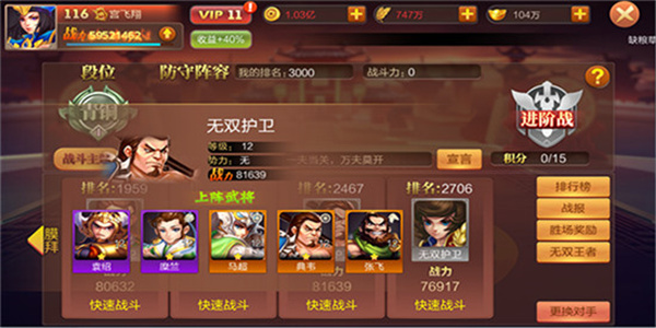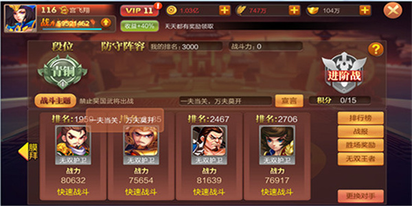 点击头像下方的“点击挑战”按钮,将弹出挑战布阵界面。挑战胜利后,将获得大量铜钱奖励。