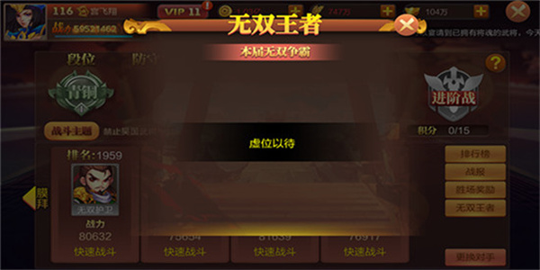 28级开放无双争霸系统,通过演武场可进入无双争霸界面。首次进入无双争霸时需先设置防守阵容队伍。