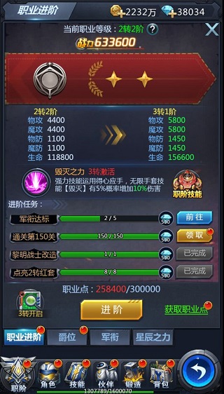 新版本的职业进阶,新增了进阶任务,玩家需要完成进阶任务,并拥有足够多的职业点才能进阶转生。玩家每完成一个进阶任务都可以获得500钻石的任务奖励!