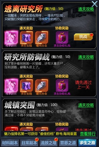 组队副本是罪恶之源,玩家除自身外,还能额外邀请两名玩家组队帮忙。协助挑战的玩家同样能收获丰厚奖励!副本成功通关后,玩家可得到大量完美碎片、曙光合金以及求生宝箱,协助挑战的玩家也能获取求生协助礼包!每一关都有独特的通关攻略,建议在挑战前仔细查看一遍。