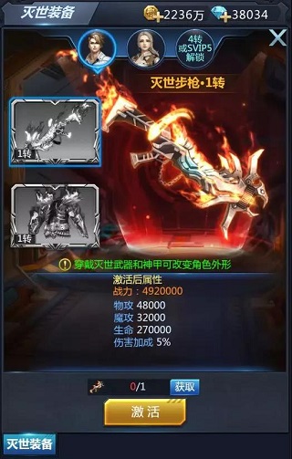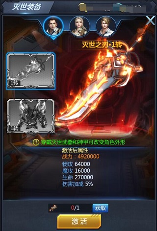 灭世装备仅包含武器与胸甲这两个部件。玩家一旦穿戴灭世装备,便能改变角色的外观形象。灭世装备的获取条件颇为苛刻,唯有通过史诗寻宝的方式才能够获得。每次进行寻宝操作,都会增加祝福值,而且祝福值越高,成功寻得灭世装备的几率也就越大。当祝福值达到满值时,必定可以获取灭世装备!