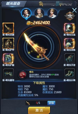 曙光装备共有八个部位,分别为武器,胸甲,头盔,护腿,腰带,项链手套,长靴。其中曙光武器与曙光胸甲还能拥有嗜血,弱化两个技能。玩家穿戴后能够获得强大的战力支持!另外曙光装备可以通过曙光寻宝获得。