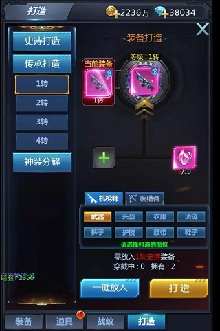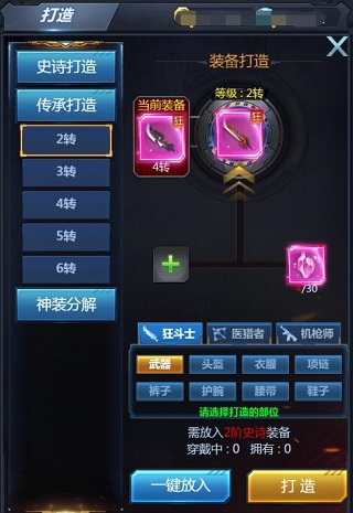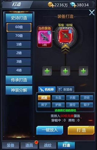 1、史诗打造能打造玩家角色当前转生等级内各级别,各个职业,各个部位的史诗装备。