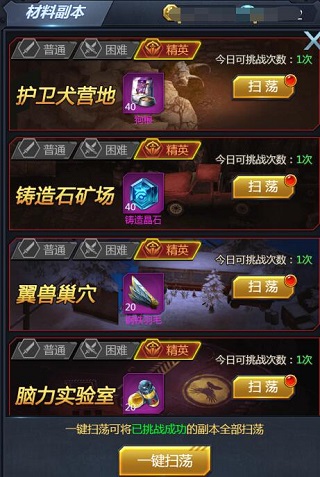 1、材料副本的玩法众多,相应的副本能够得到狗粮、铸造石、脑力因子、羽毛、血清、电子元件等相应的提升材料。