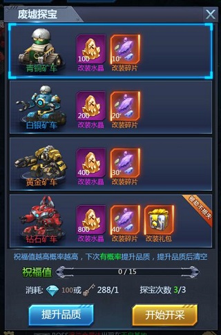 除此之外,玩家可以前往废墟矿洞进行挖矿,在矿洞里启动矿车就能获得改装水晶与改装碎片,启动钻石矿车的话还可以获得改装礼包!玩家也可以在矿洞里通过掠夺他人的矿车获得材料!
