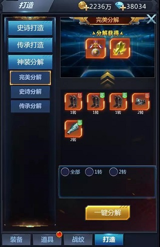 3、神装分解分为:完美分解、史诗分解和传承分解。分解装备后能获得BOSS印记与精炼石。