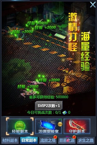 1、经验副本,从名字就能看出,这是一种能获取大量经验的副本。玩家在挑战该副本时,只要击杀怪物的数量达到完成任务所需数量,就能完成副本任务。每位玩家每天有1次挑战机会,随着SVIP等级的提高,每日挑战次数也会相应增加。挑战成功后,玩家可依据自身需求,选择领取一倍、二倍或三倍的经验奖励。