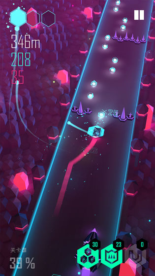 1玩法极其简单,玩家操控小车在高速公路上行驶,只需左右滑动,就能在三条轨道间来回切换。行驶过程中,路上会随机出现节奏小点,如同玩吃豆人游戏一般,将其吃掉即可,同时还能积累能量。