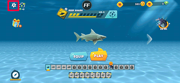 1、打开饥饿的鲨鱼进化手机版,在游戏主界面找到并点击左上角的“齿轮”按钮;