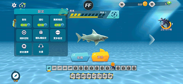 3、在广阔无垠、允许随意漫游的巨大海底世界中,有13种类型的鲨鱼有待探索。该海底世界支持直接触摸操作模式或重力感应操作模式。