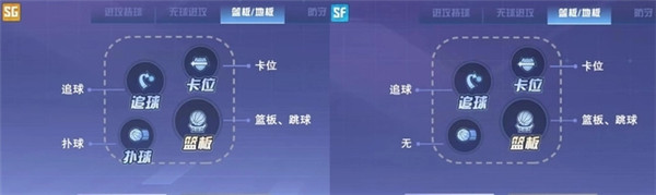 不过这里需要注意的是,不同职业的技能按键的位置会有一定的区别,比如:在玩家使用SG角色时,在篮板/地板的技能键上就会增加扑球的按键,而在使用SF角色时,在进攻持球的功能键上则没有改按键.