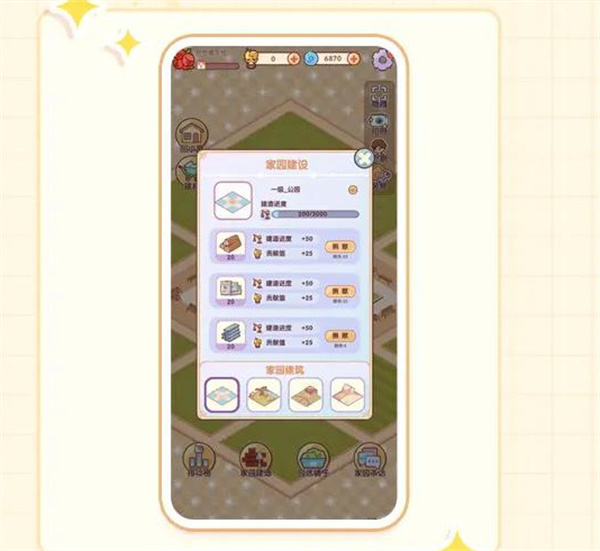 得到足够的建材后就可以进行家园建设!点击捐献即可向家园捐出拥有的建材,即可获得相应的建造进度和贡献值。