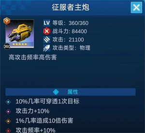 征服者主炮,即便从征服者套装中单独拎出来,实力也不容小觑。它具备极高的攻击力,伤害十分可观,是一件简单直接且威力强大的装备。一旦你能获得这门主炮,推图速度将大幅提升。
