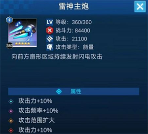雷神主炮以向正前方扇形区域持续发射闪电的方式进行攻击,技能效果极为炫酷,在应对小型飞机时效果显著。作为雷神套装里的主炮部件,它堪称清理小怪的强力武器,实用性极高。