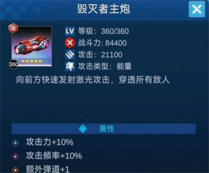 这枚主炮隶属于毁灭者套装,其独特之处在于攻击时能发射激光,不仅攻击速度极快,还可穿透前方全部敌人。毁灭者主炮性能较为均衡,适用于游戏里的各类场景。