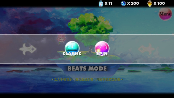在此模式中,无论歌曲难度如何,仅允许单击音符,雪花将毫无规律、没有固定轨迹地飘落(玩过兰空的朋友能迅速领会)。同时,背景会时不时出现无意义的雪花来干扰玩家,该模式对瞬时反应能力要求极高(当然,你也可以把下落速度调慢一些)。紧接着便是魔法光球模式。