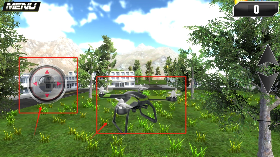 3、左边圆盘控制方向,右边上下箭头调高度,无人机停在草地上准备起飞。
