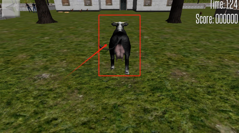 2、让奶牛撞倒房子和树木,看右上角计时和分数往上涨。