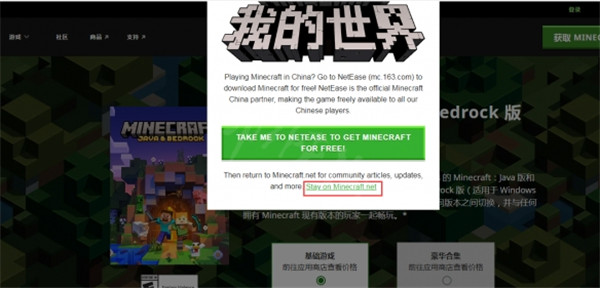 2.进入官网会跳出这一个弹窗,当看到下面的弹窗时,要点击“Stay onMinecraft.net”。
